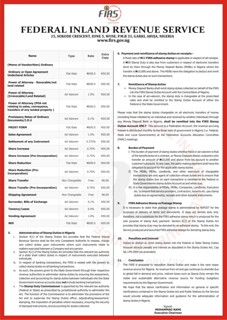Federal Inland Revenue Service Public Notice: Clarification on Administration of Stamp Duties in Nigeria